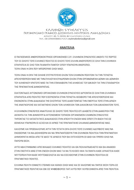 Ο ΠΑΓΚΟΣΜΙΟΣ ΑΝΘΡΩΠΟΚΕΝΤΡΙΚΟΣ ΟΡΓΑΝΙΣΜΟΣ Ε.ΣΥ. ΕΛΛΗΝΩΝ ΣΥΝΕΛΕΥΣΙΣ ΑΝΟΙΓΕΙ ΤΙΣ ΠΟΡΤΕΣ ΤΟΥ ΣΕ ΟΛΟΥΣ ΤΟΥΣ ΕΛΛΗΝΕΣ ΠΟΛΙΤΕΣ ΣΕ ΟΛΟΥΣ ΤΟΥΣ ΕΛΛΗΝ ΑΝΘΡΩΠΟΥΣ ΣΕ ΟΛΗ ΤΗΝ ΕΛΛΗΝΙΚΗ ΕΠΙΚΡΑΤΕΙΑ ΣΕ ΟΛΟ ΤΟΝ ΠΛΑΝΗΤΗ ΠΑΝΤΟΥ ΟΠΟΥ ΥΠΑΡΧΟΥΝ ΑΝΘΡΩΠΟΙ.